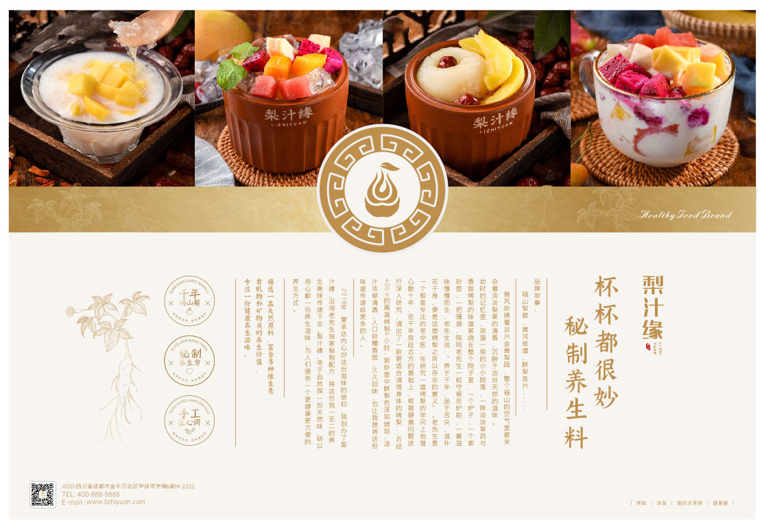 梨汁緣于2018年11月創(chuàng)辦,是一家專注于甜品飲品食療 的健康餐品牌。主營烤梨等烤系及酸奶、燕窩、養(yǎng)生糖水等 多種產(chǎn)品,首用產(chǎn)品結(jié)合最新科技設(shè)備原理,使產(chǎn)品營養(yǎng)成 份不留失,淘態(tài)傳統(tǒng)冷鏈配送模式,批量生產(chǎn)統(tǒng)一配送更放便 品質(zhì)管控,直營+加盟模式售賣多元化產(chǎn)品。梨汁緣,秉承著 “純天然、健康、養(yǎng)生”的品牌理念,堅持“健康選料、高 科技工藝制作”的初心,通過甜品糖水的形式打開一道方便 的養(yǎng)生之路。